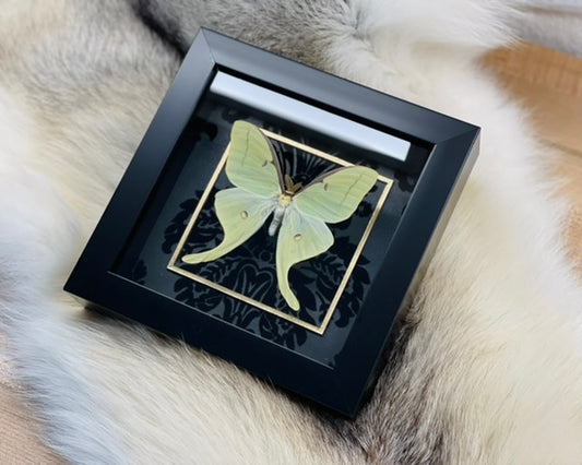 Deluxe framed Luna Moth with golden line accent on black velvet
