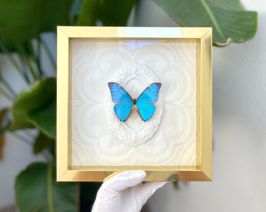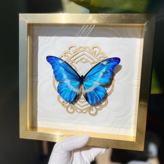 Deluxe framed Morpho achilles butterfly with gold accent