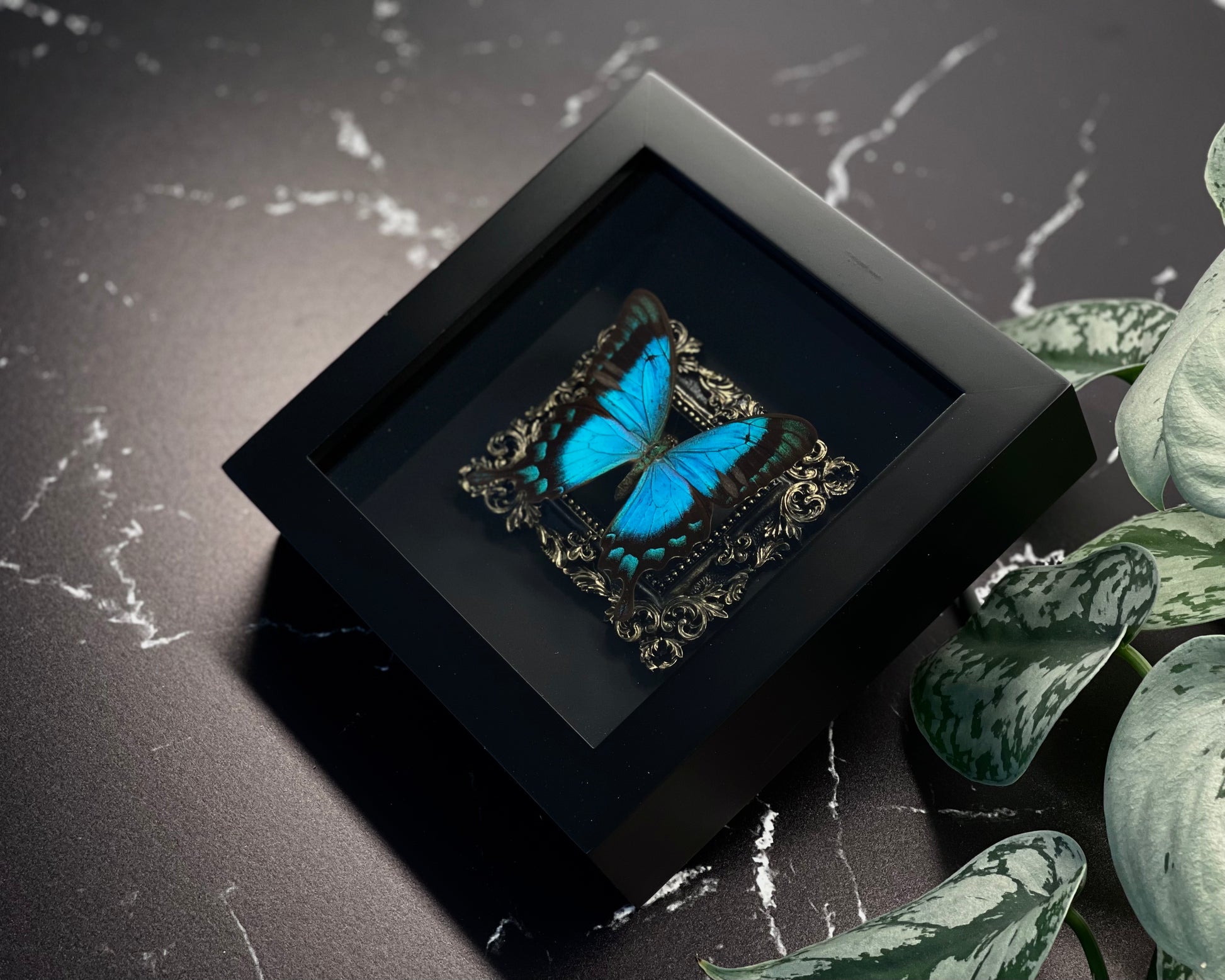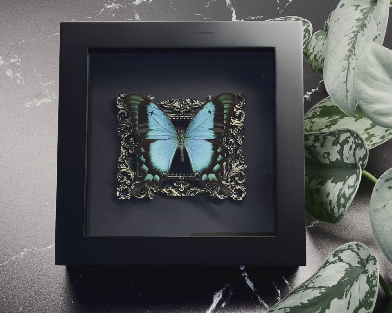 Frame: Inside 6"x 6" shadow box. 1¾" deep. Outside measured 7"x7". Can be hung on the wall or stand on its own.