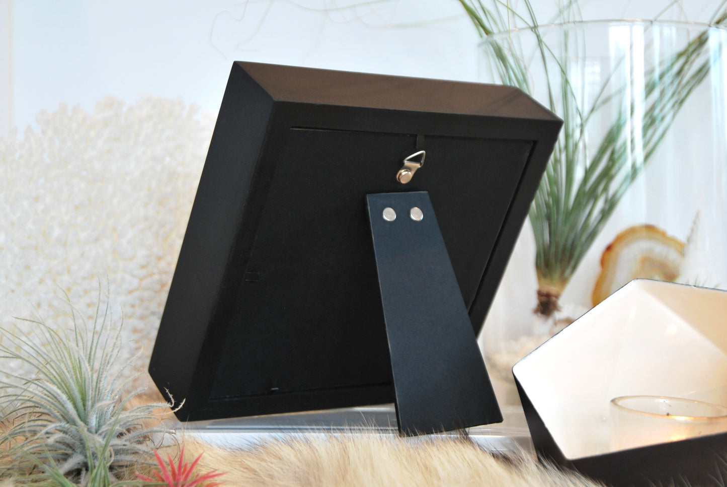 Frame: Inside 6"x 6" shadow box. 1¾" deep. Outside measured 7"x7". Can be hung on the wall or stand by its own.