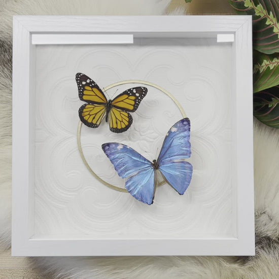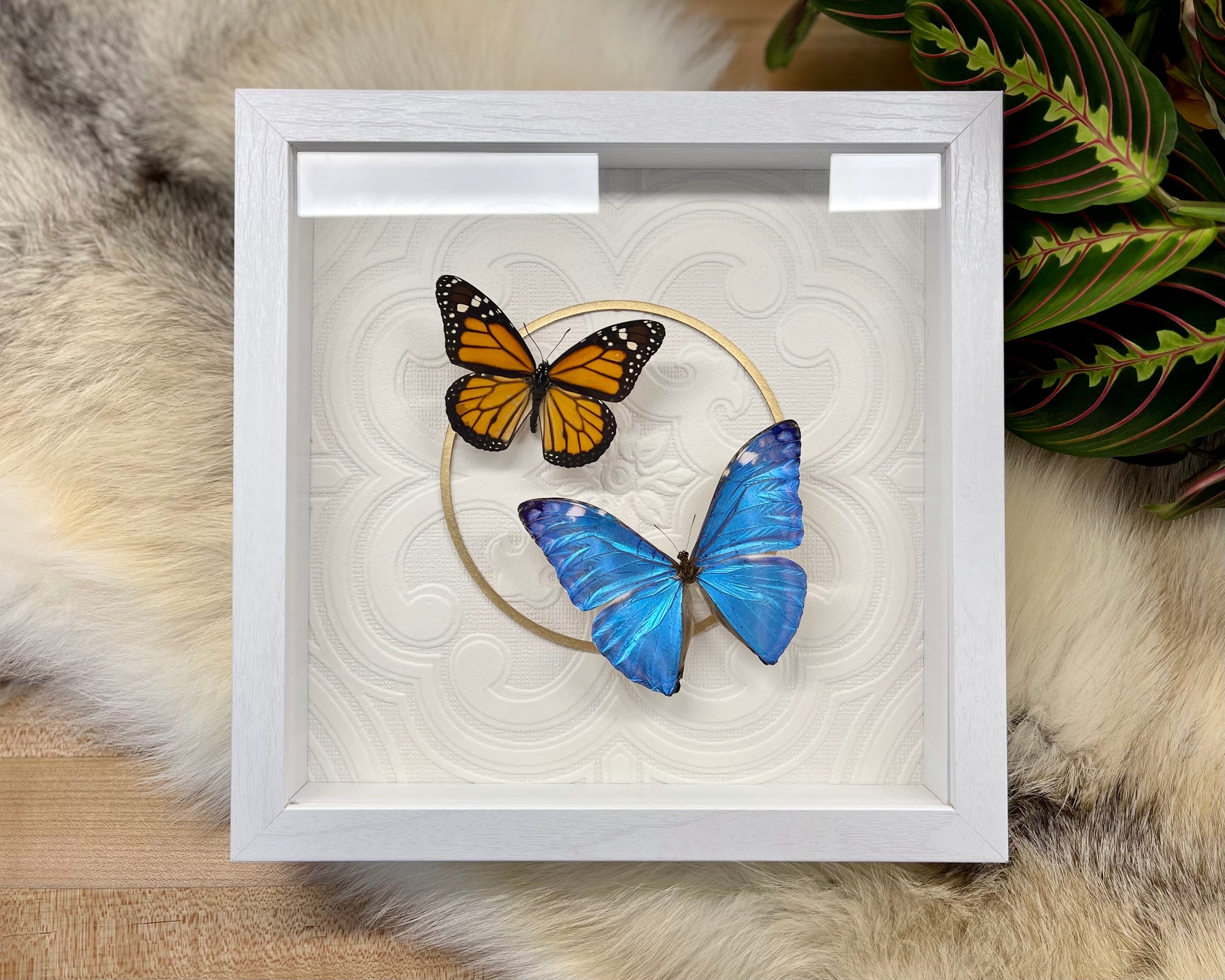 Frame: 9"x9" shadow box. 1¾" deep. Outside measured 10"x10". Can be hung on the wall or stand on its own.
