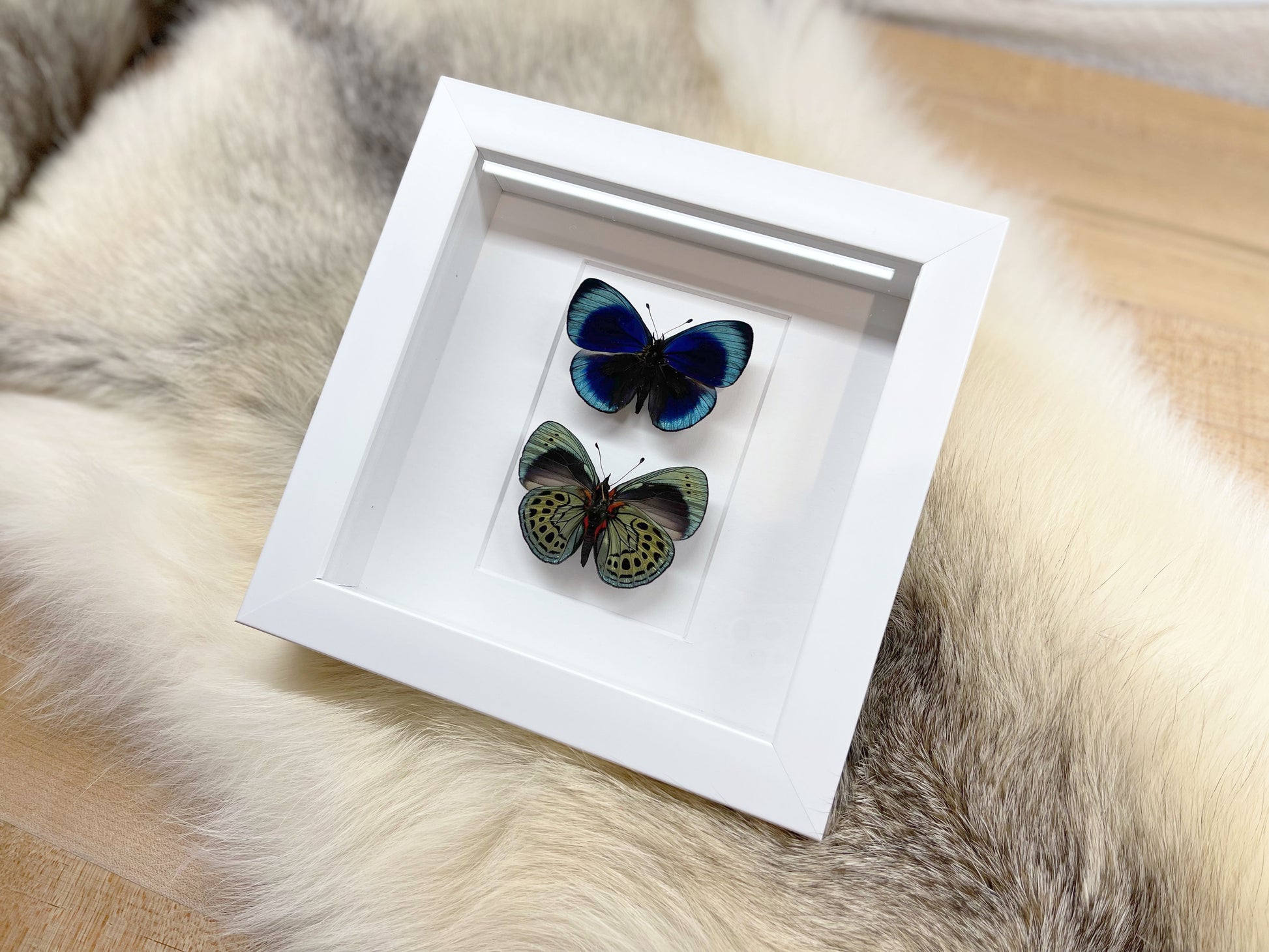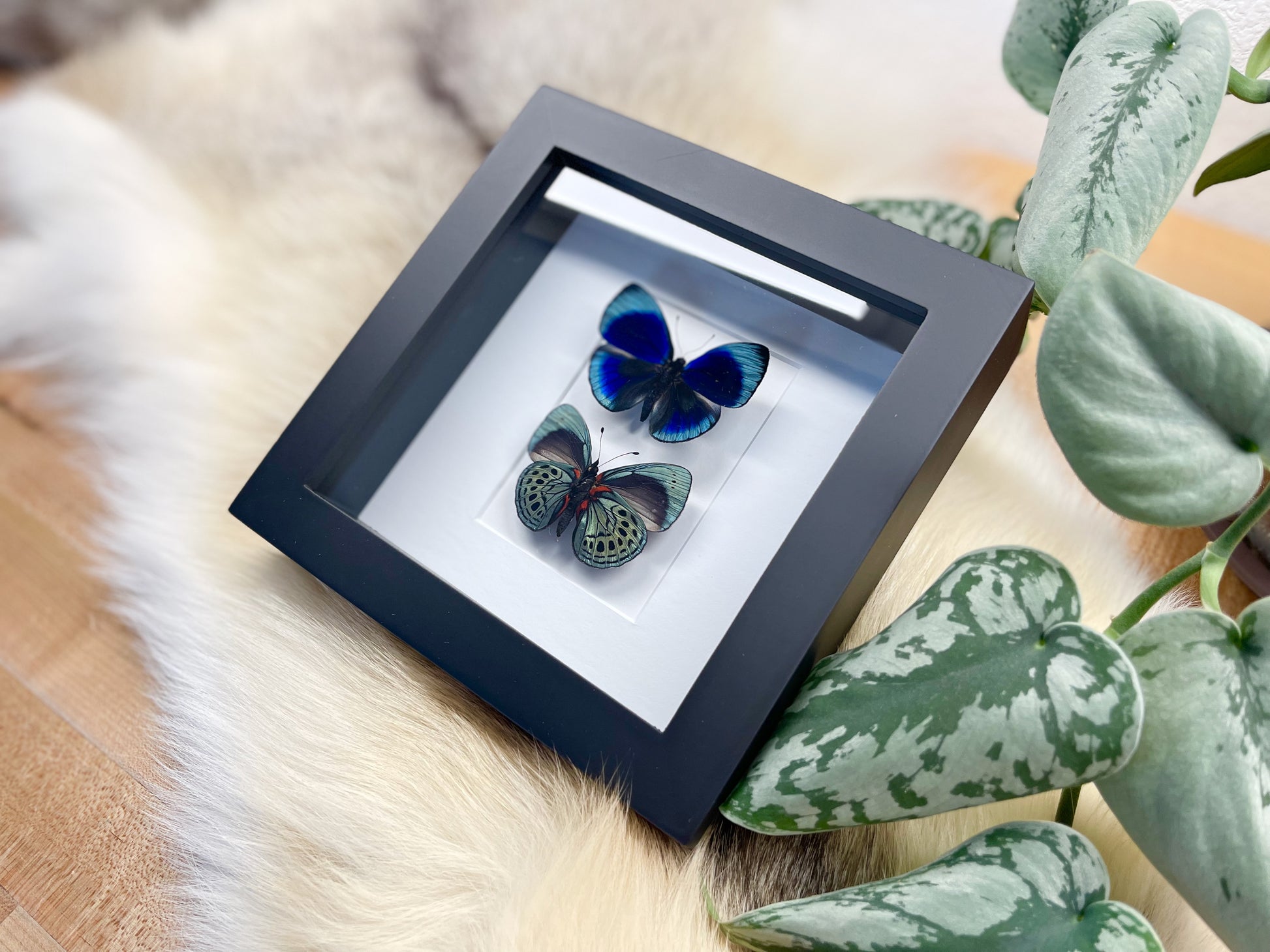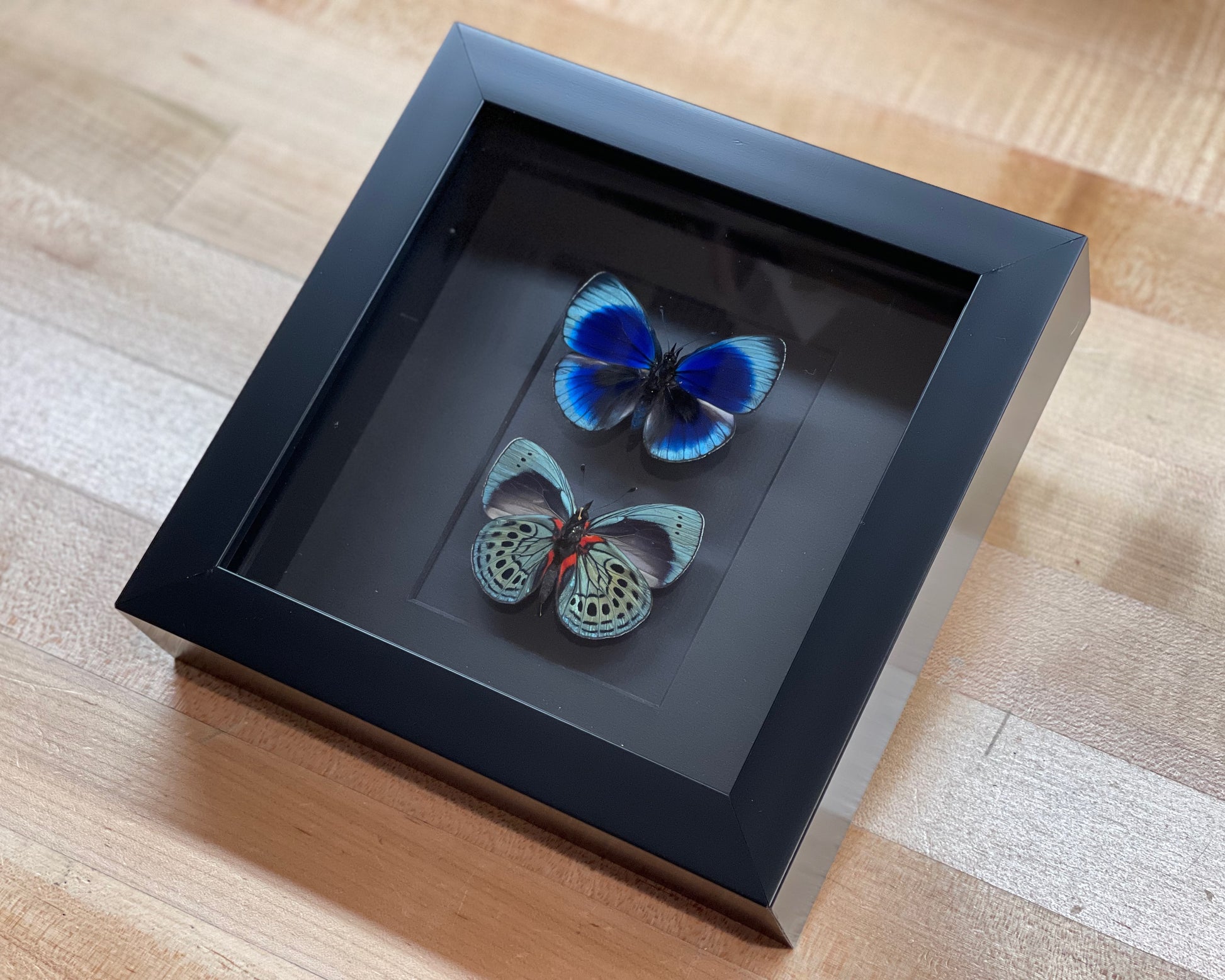 Frame: Inside 6"x 6" shadow box. 1¾" deep. Outside measured 7"x7". Can be hung on the wall or stand on its own.