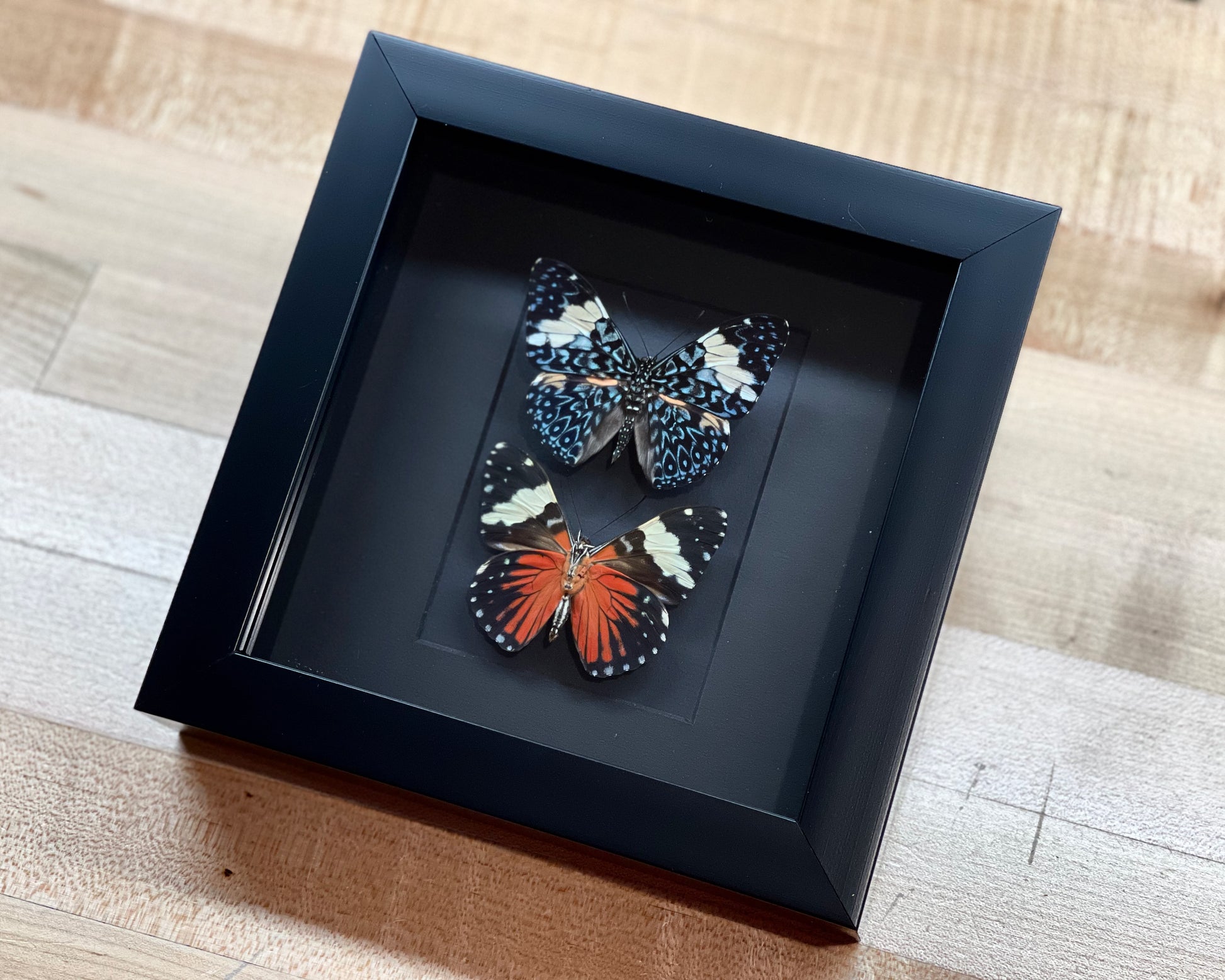 Frame: Inside 6"x 6" shadow box. 1¾" deep. Outside measured 7"x7". Can be hung on the wall or stand on its own.