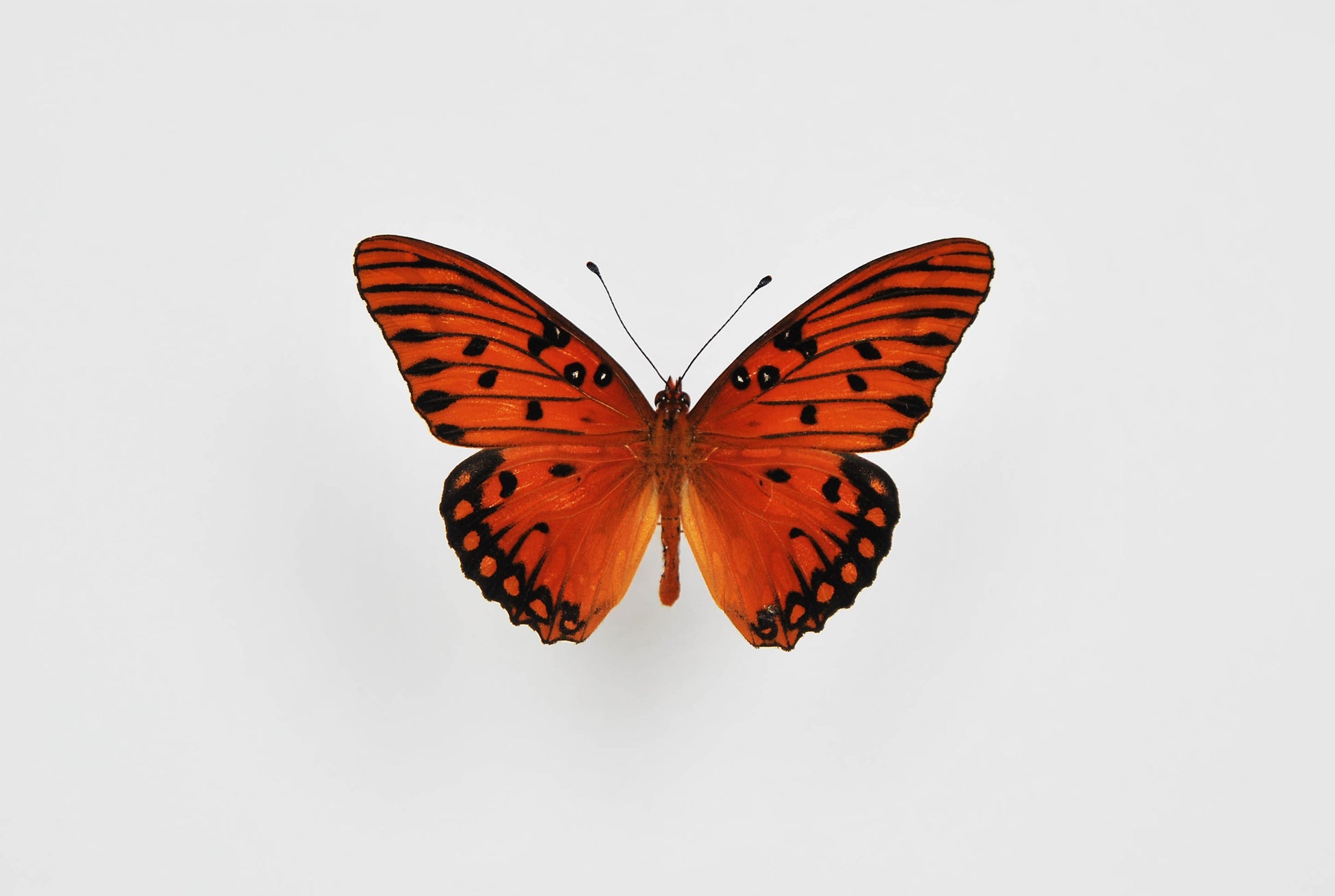 This frame showcases both the underside and upper side of the Agraulis vanillae nigrior butterfly. It has a beautiful warm sunset color palette of reds and oranges, with magnificent raised silver spots and markings, which appear as white spots in the photo but are actually metallic silver in person!