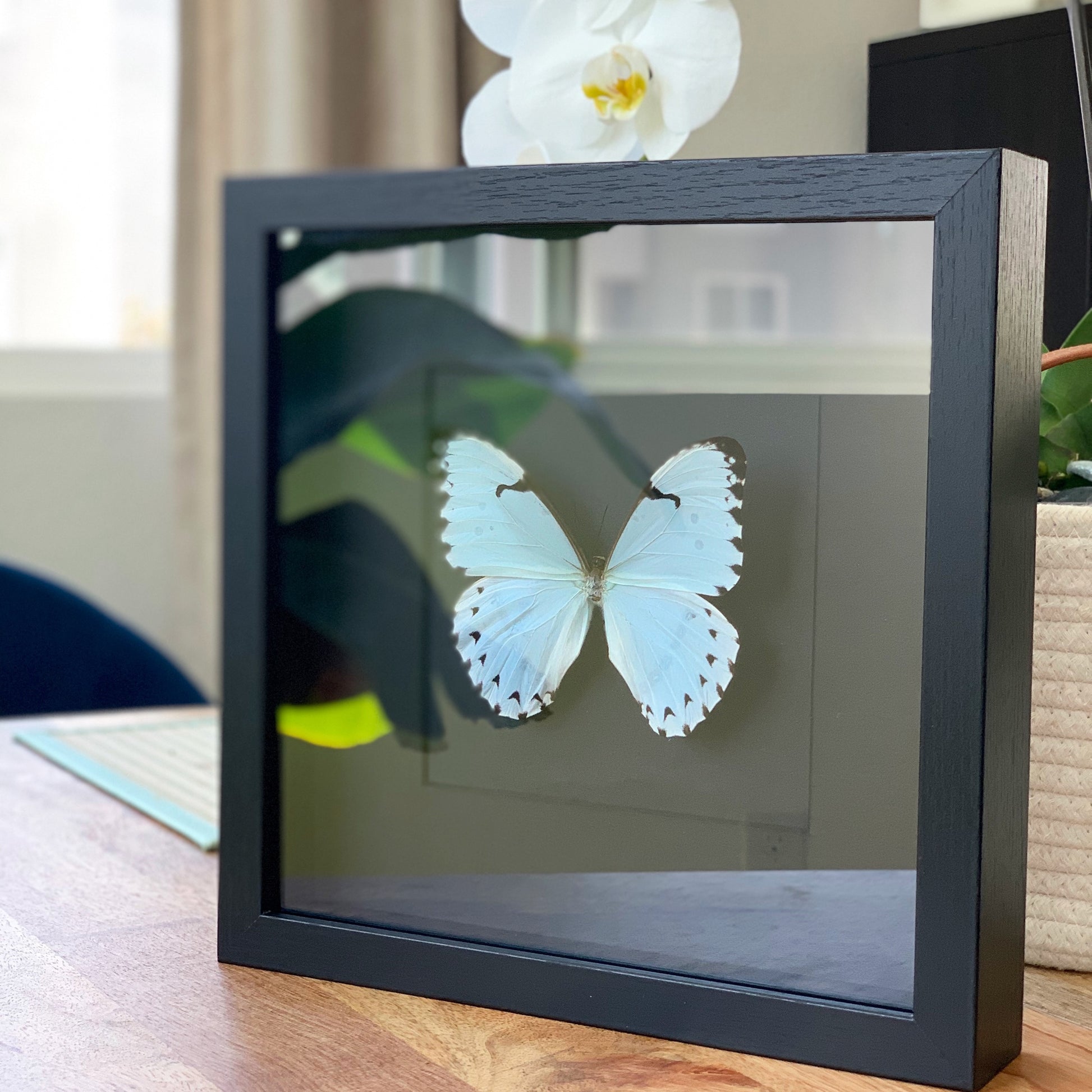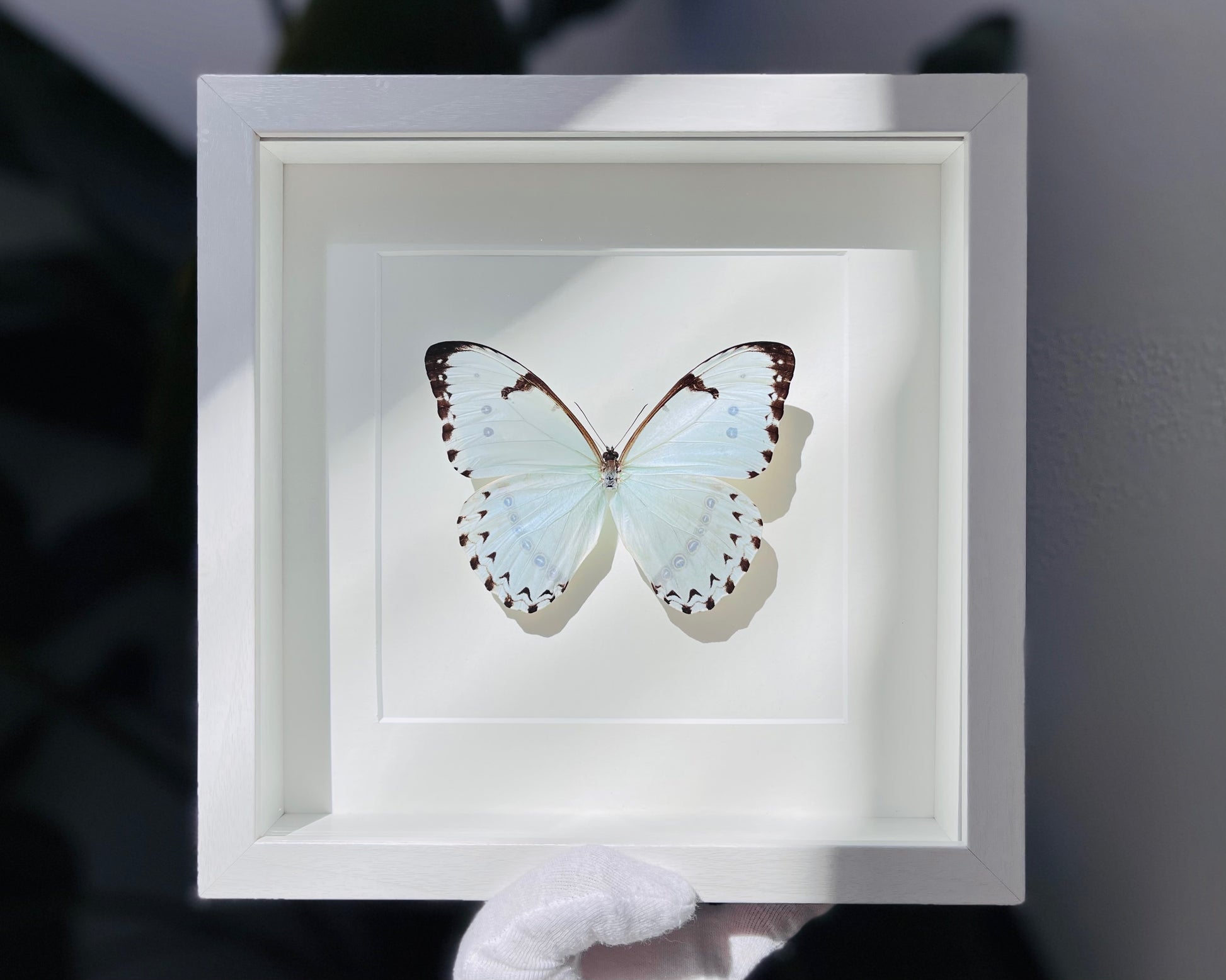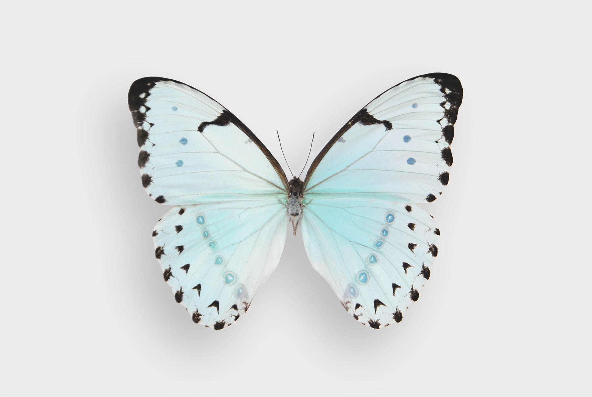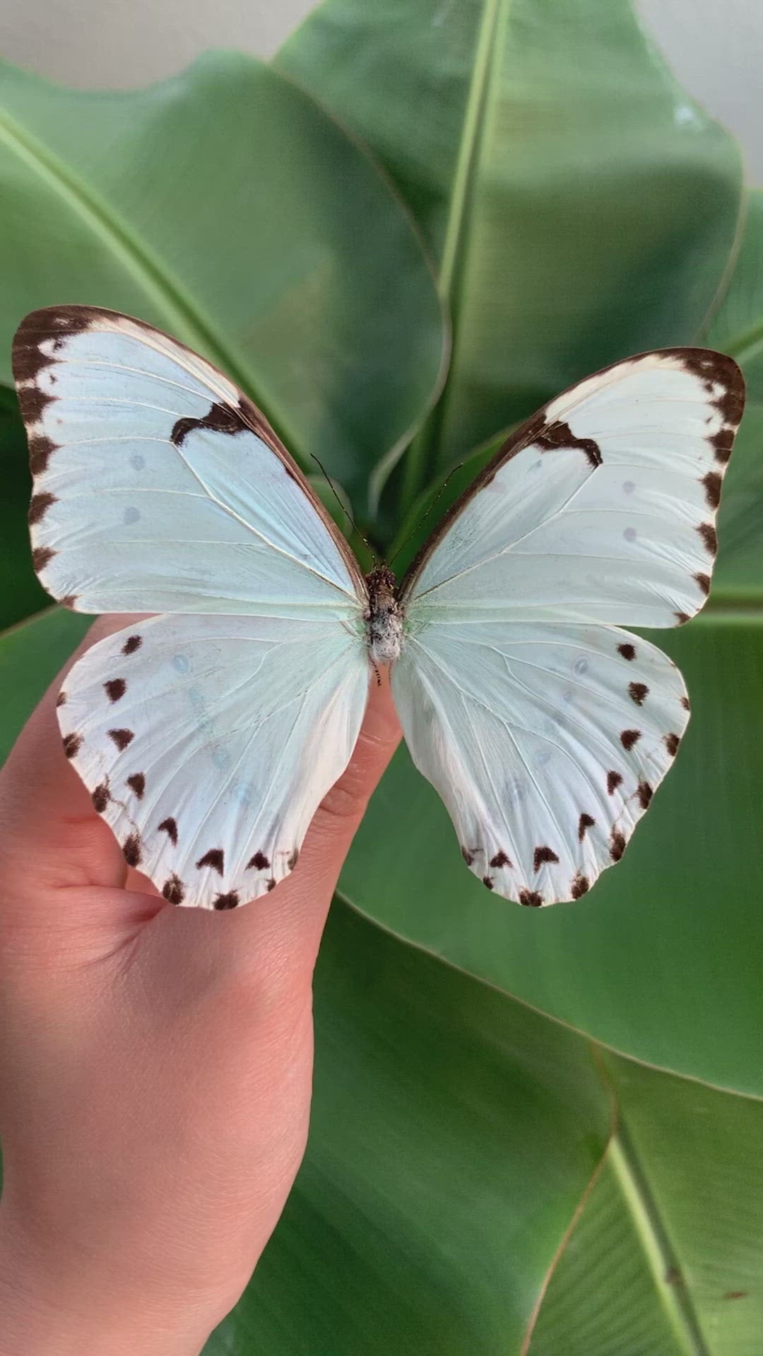 The morpho catenarius, lacks the usual bright blue coloration of many Morpho species. The translucent surfaces of the wings vary from a pale blue color to almost white. The edges of the wings show a series of black spots, while the hindwings are crossed by several small "eyes".