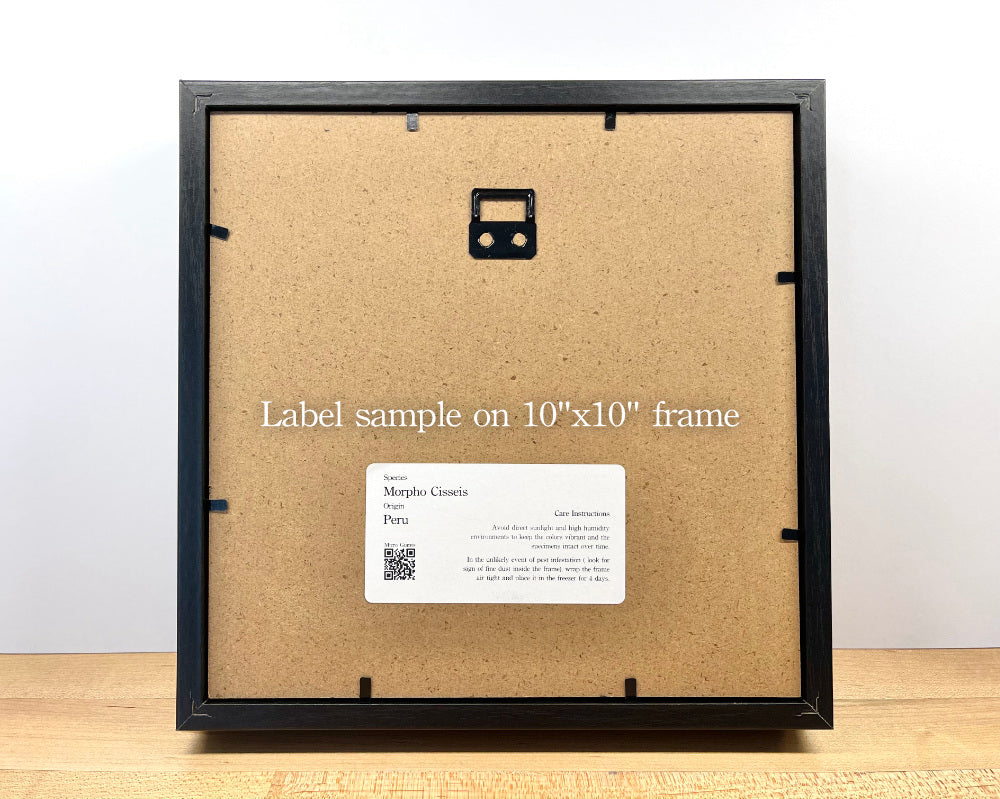 Frame: 9"x9" shadow box. 1¾" deep. Outside measured 10"x10". Can be hung on the wall or stand on its own.