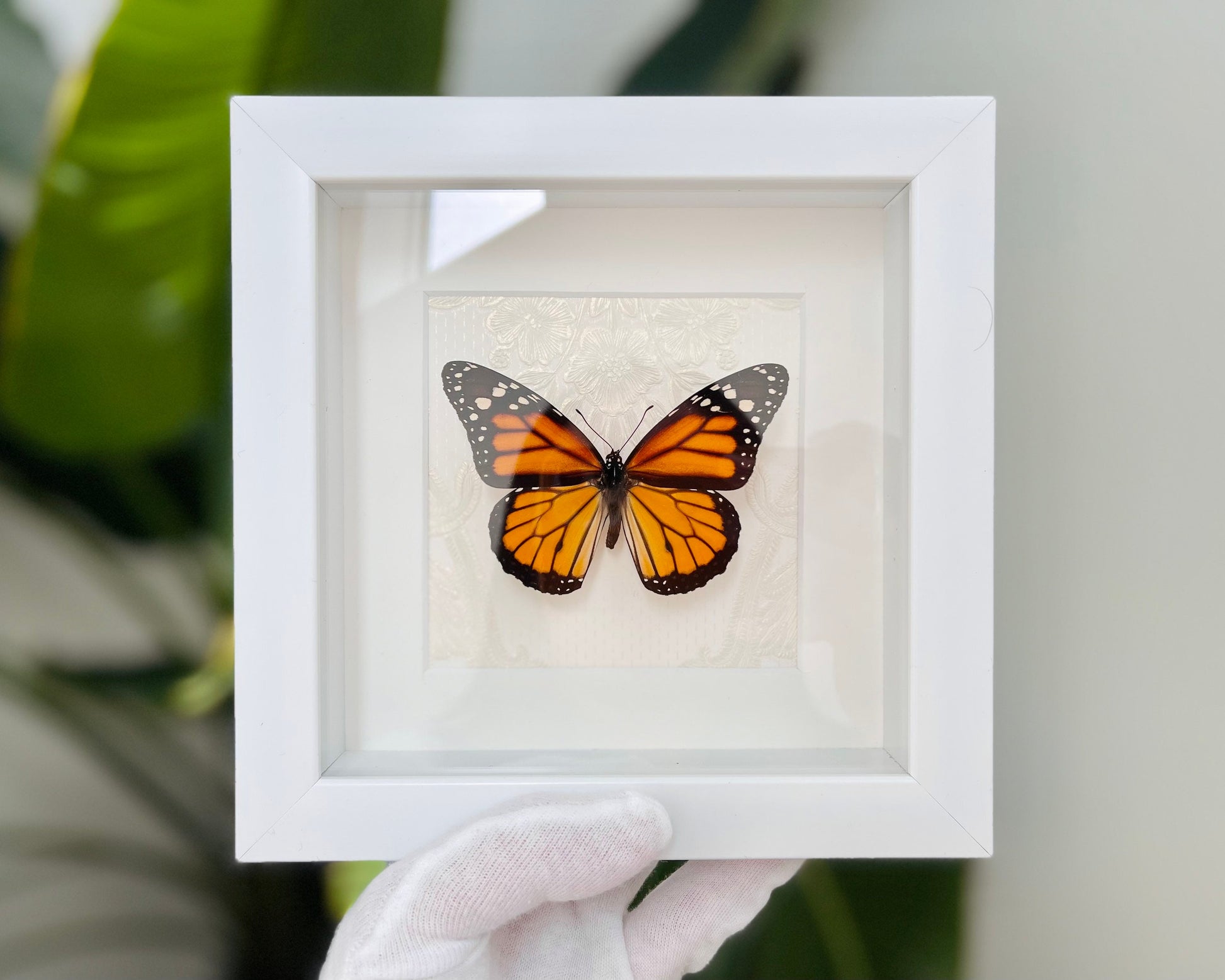 Frame: Inside 6"x 6" shadow box. 1¾" deep. Outside measured 7"x7". Can be hung on the wall or stand on its own.