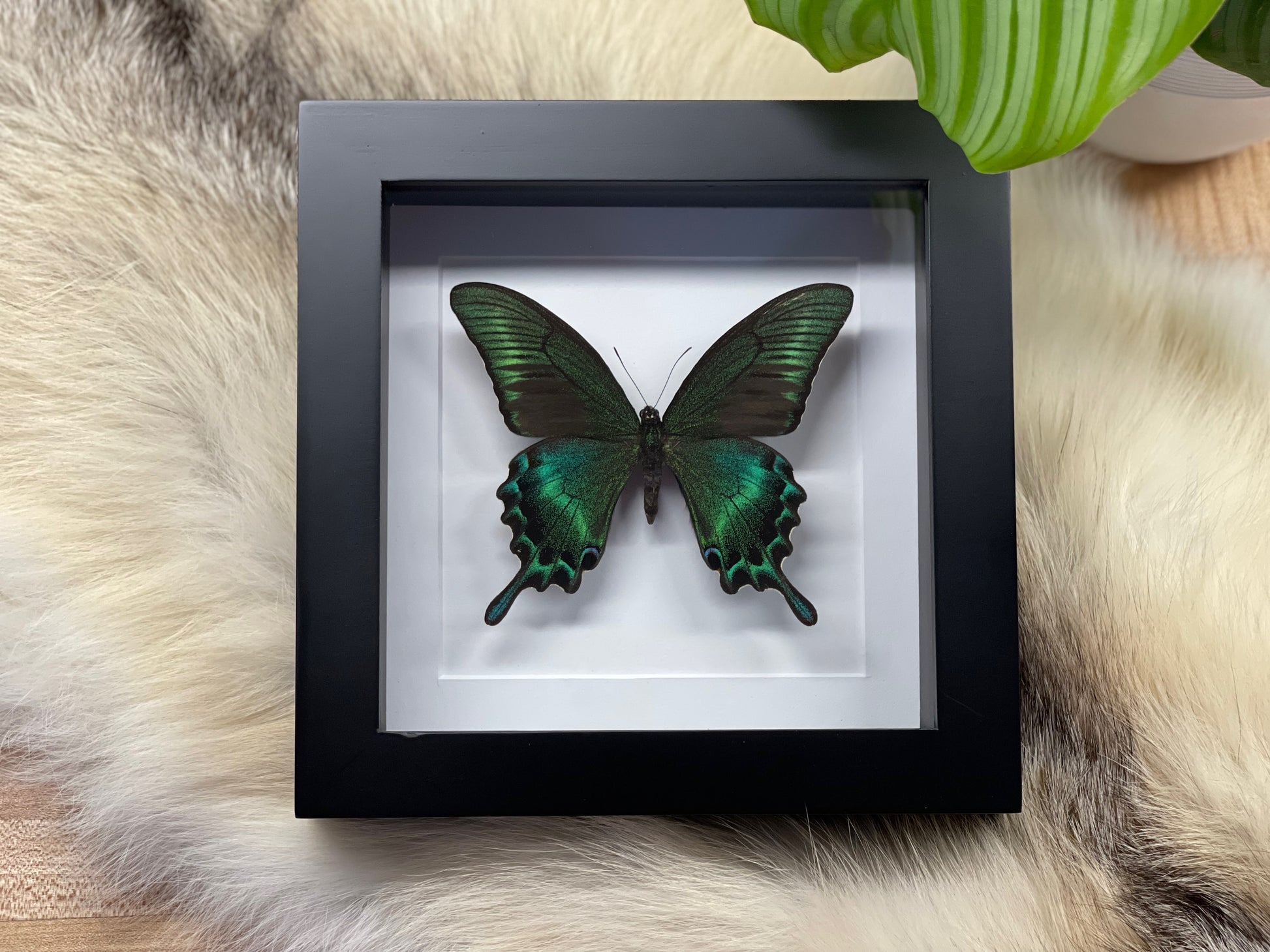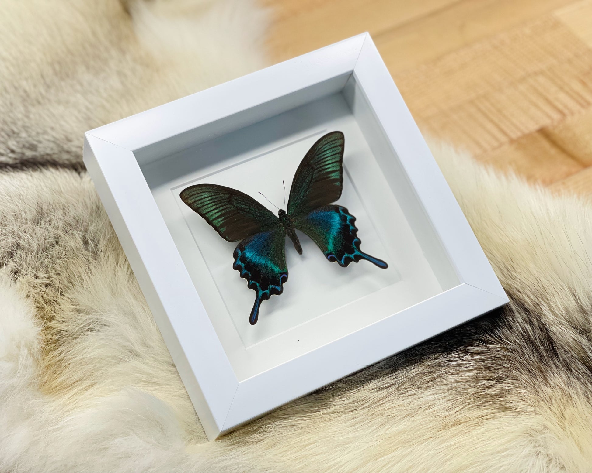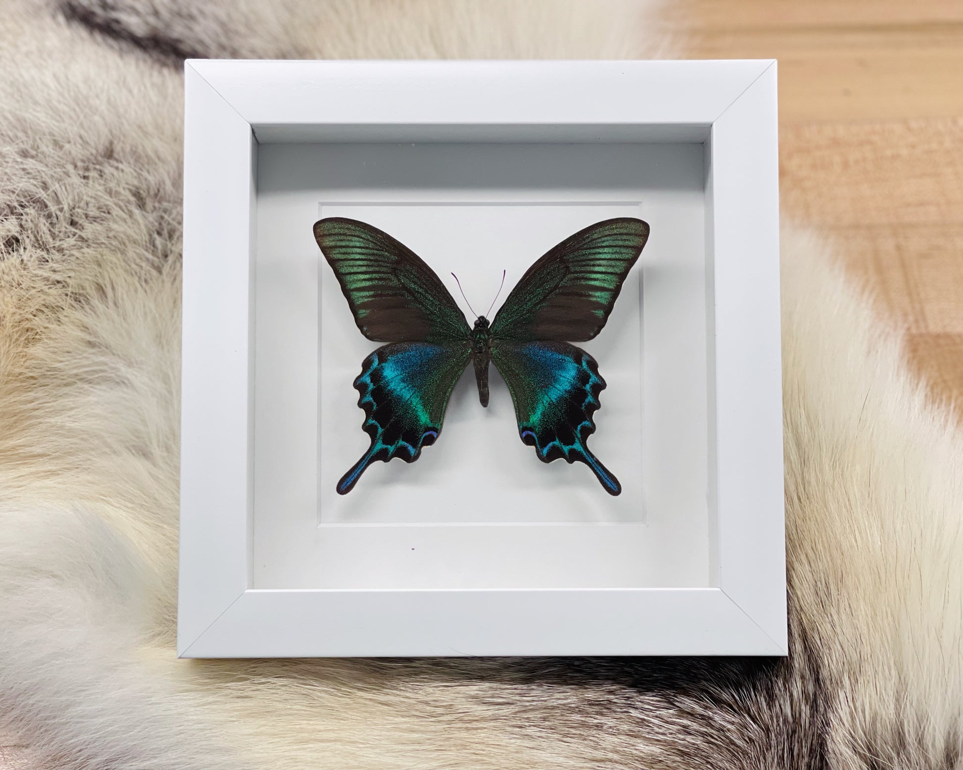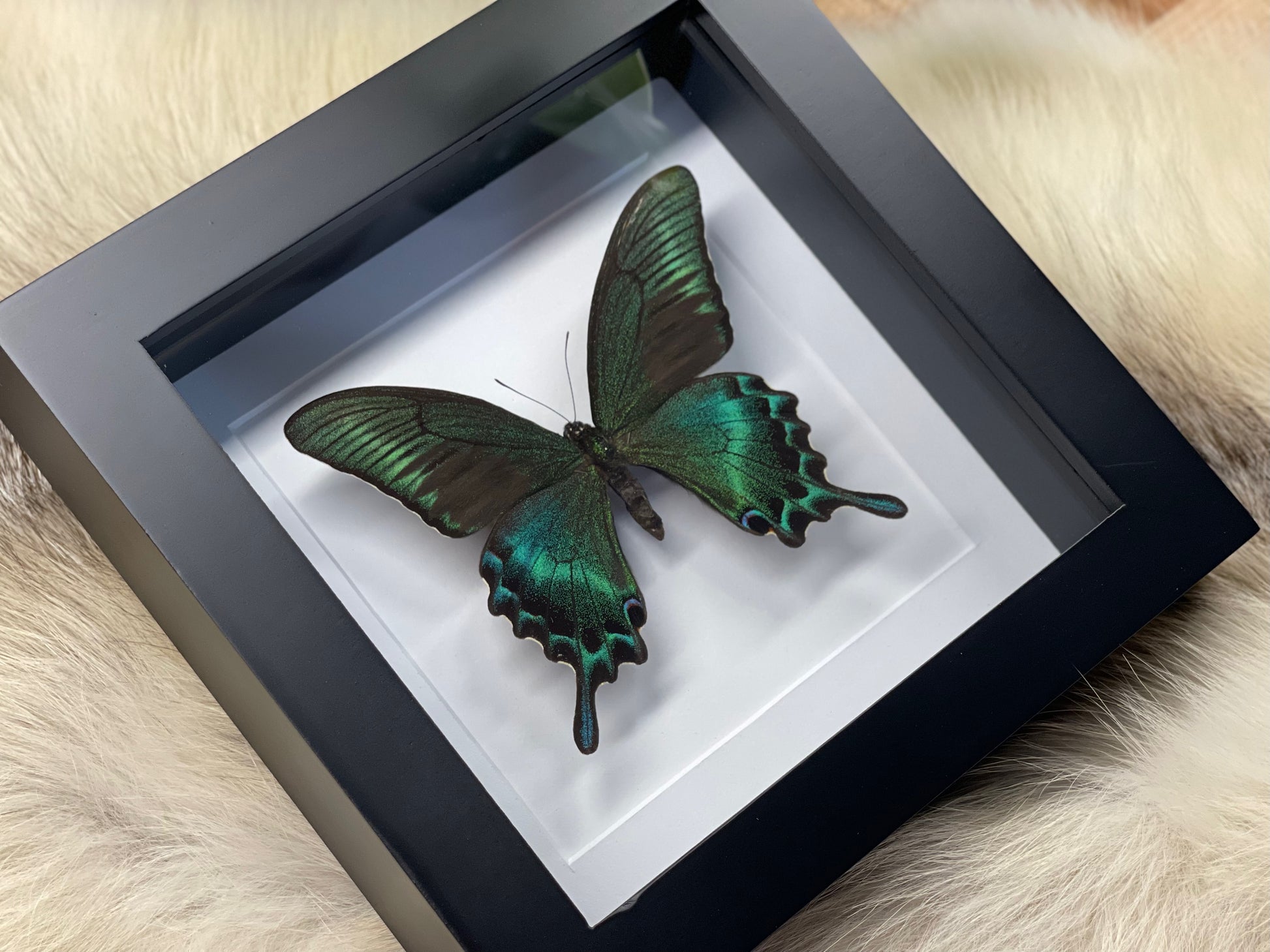 Frame: Inside 6"x 6" shadow box. 1¾" deep. Outside measured 7"x7". Can be hung on the wall or stand on its own.
