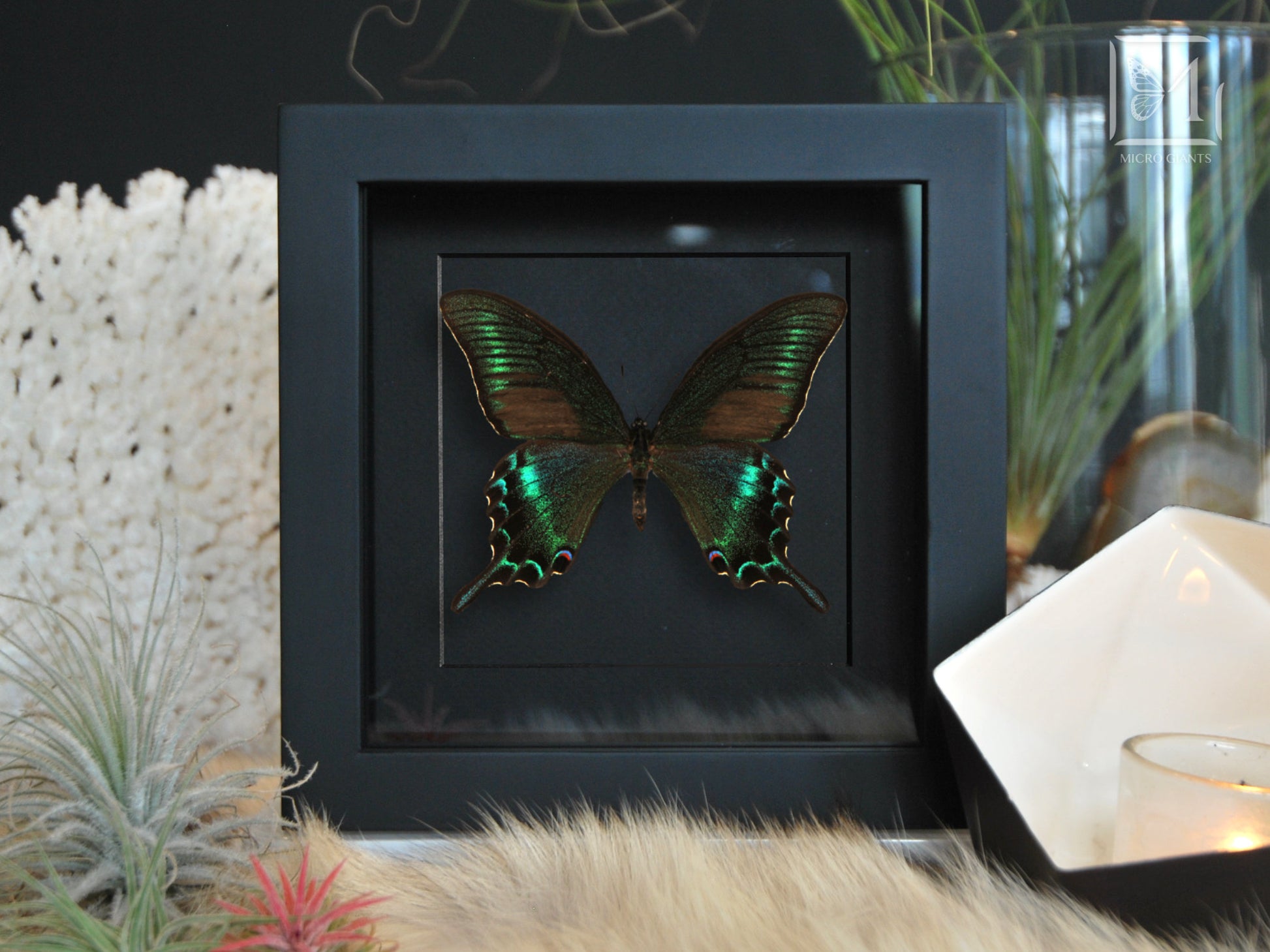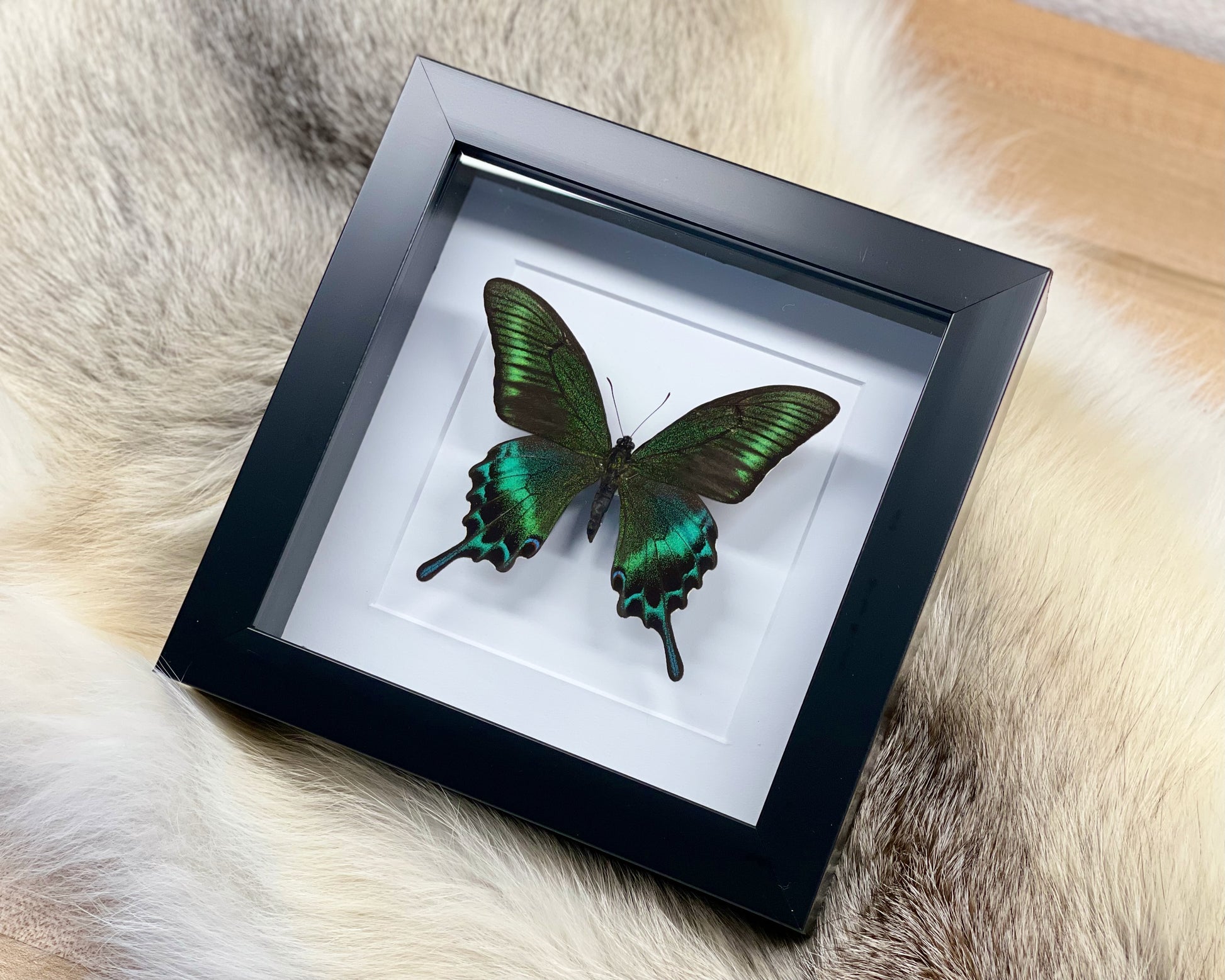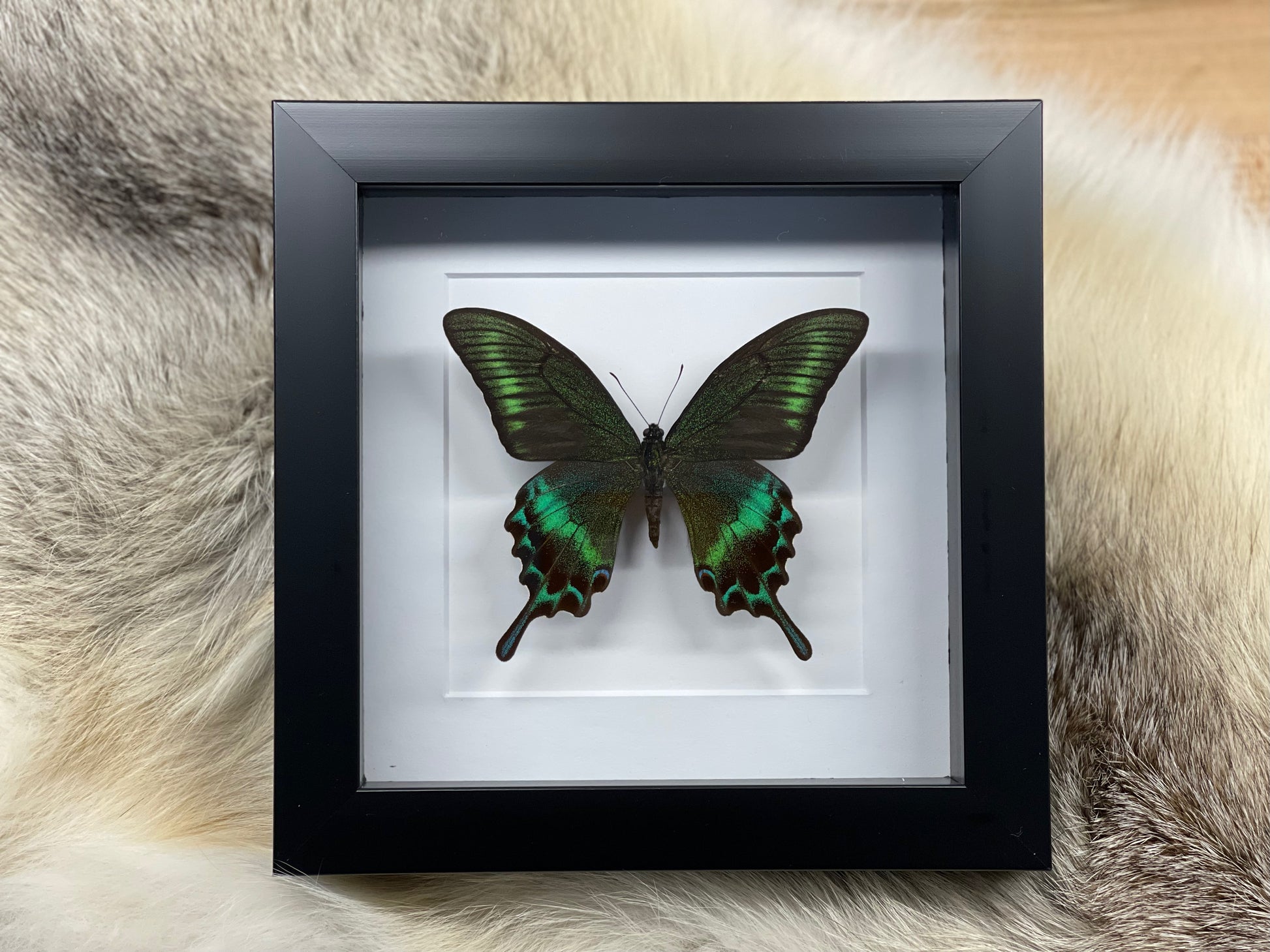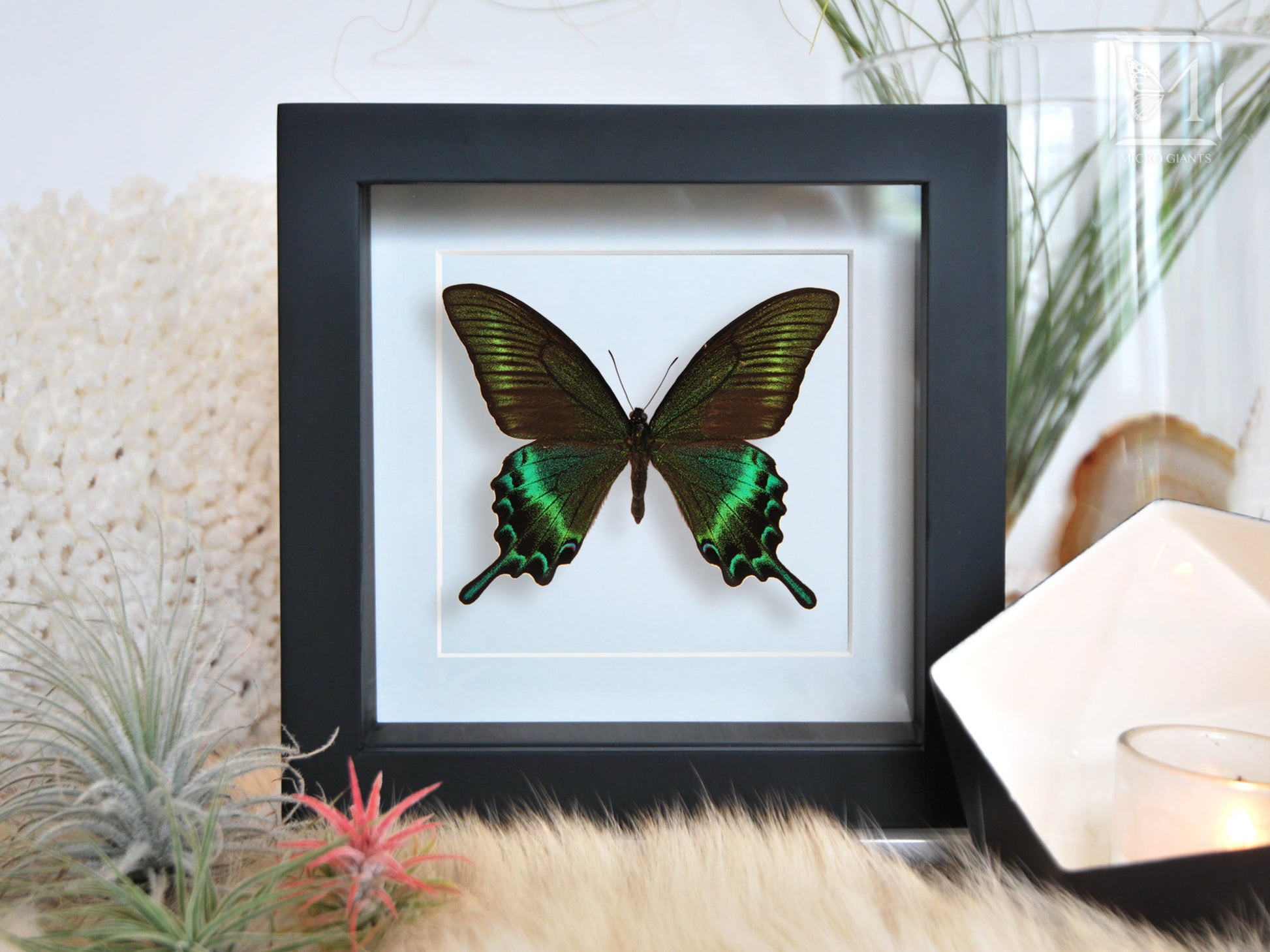 Frame: Inside 6"x 6" shadow box. 1¾" deep. Outside measured 7"x7". Can be hung on the wall or stand on its own.