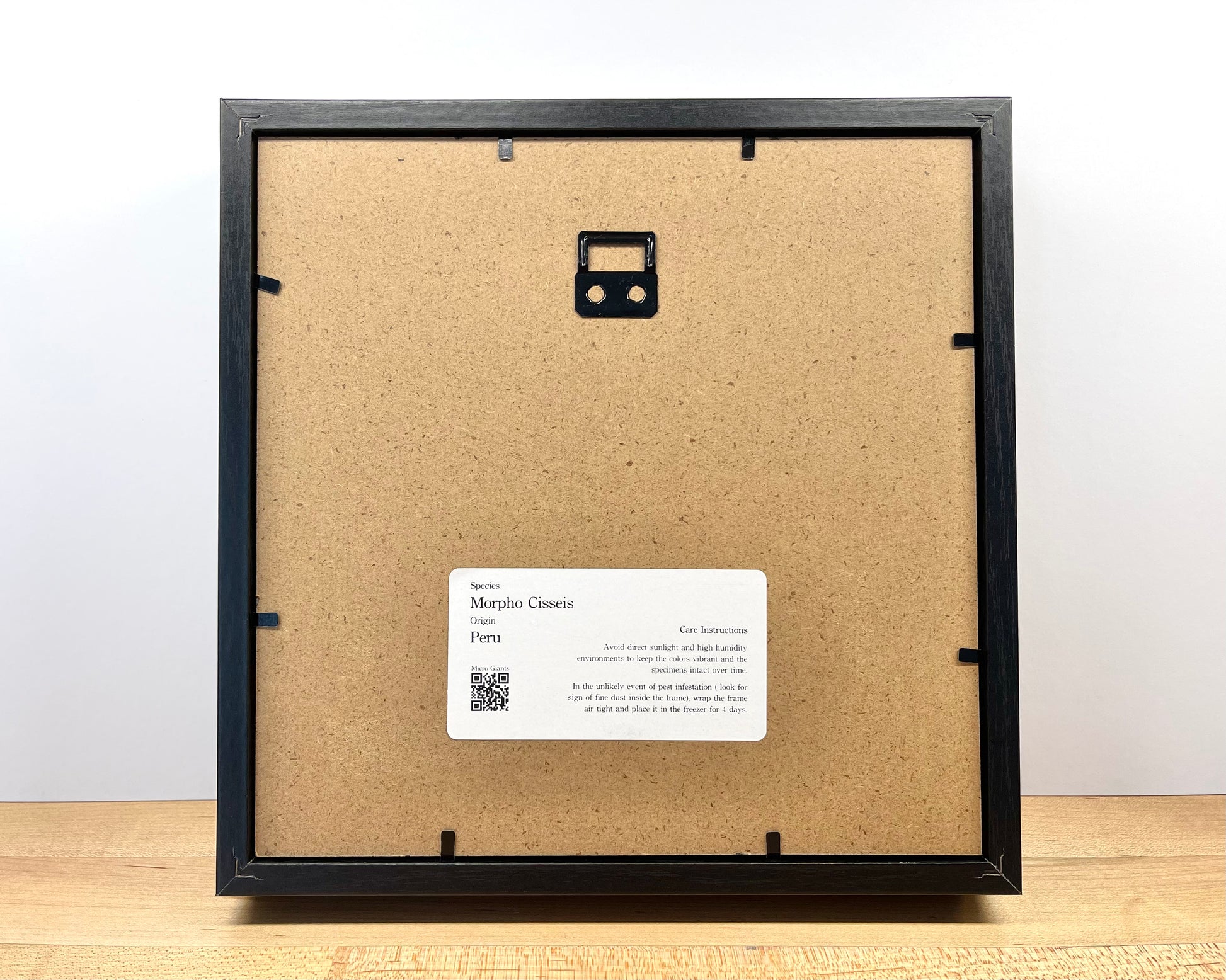 Frame: Inside 6"x 6" shadow box. 1¾" deep. Outside measured 7"x7". Can be hung on the wall or stand on its own.