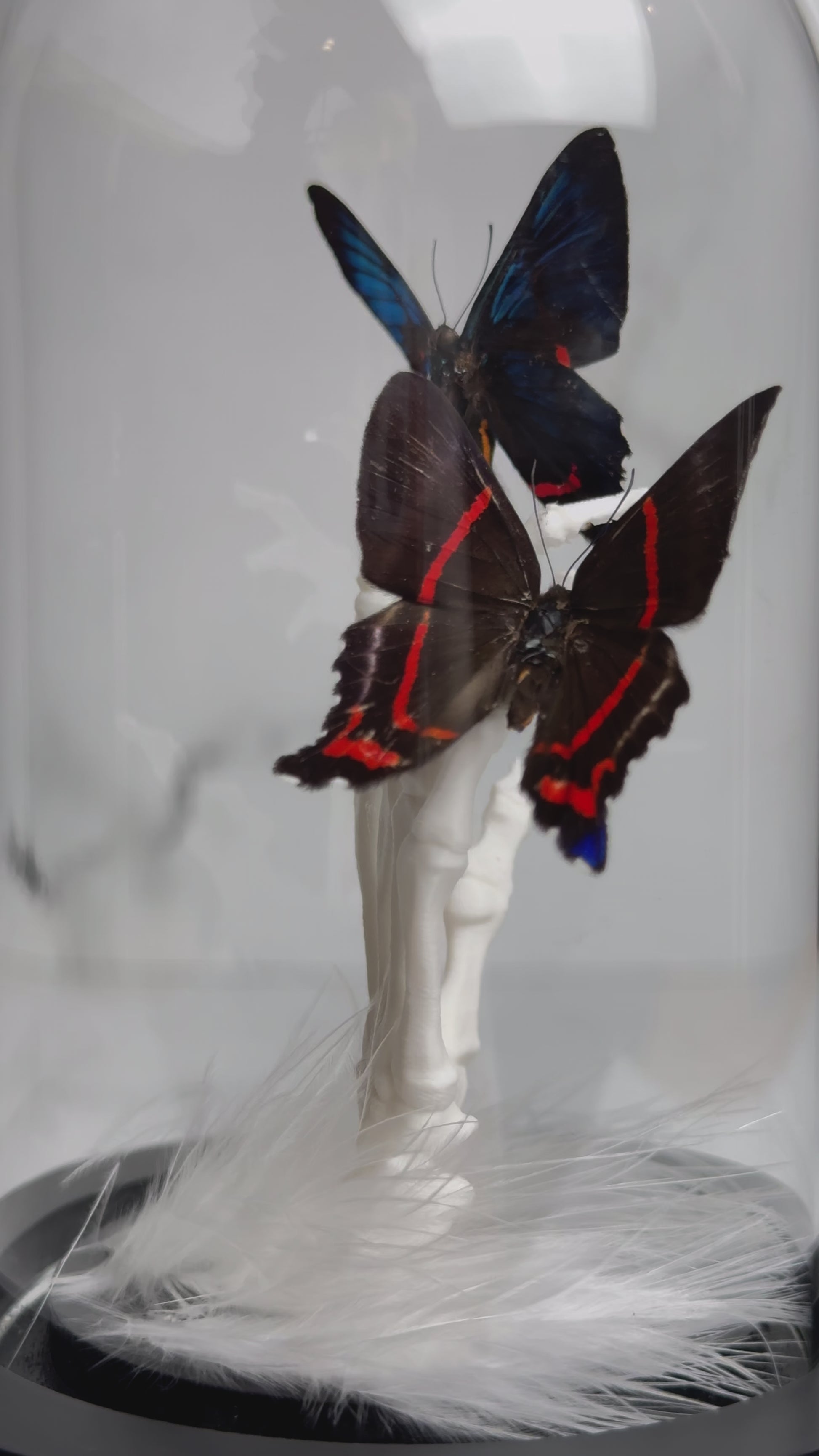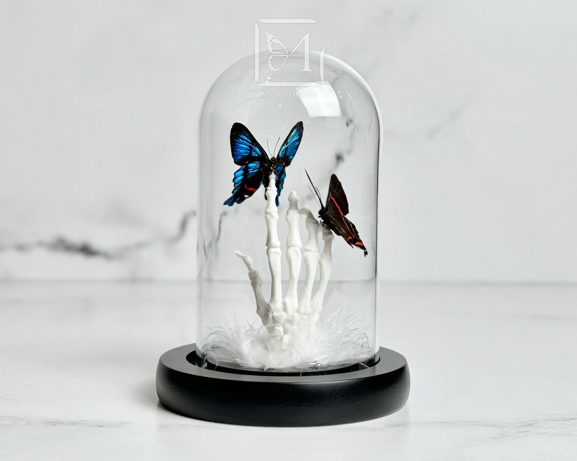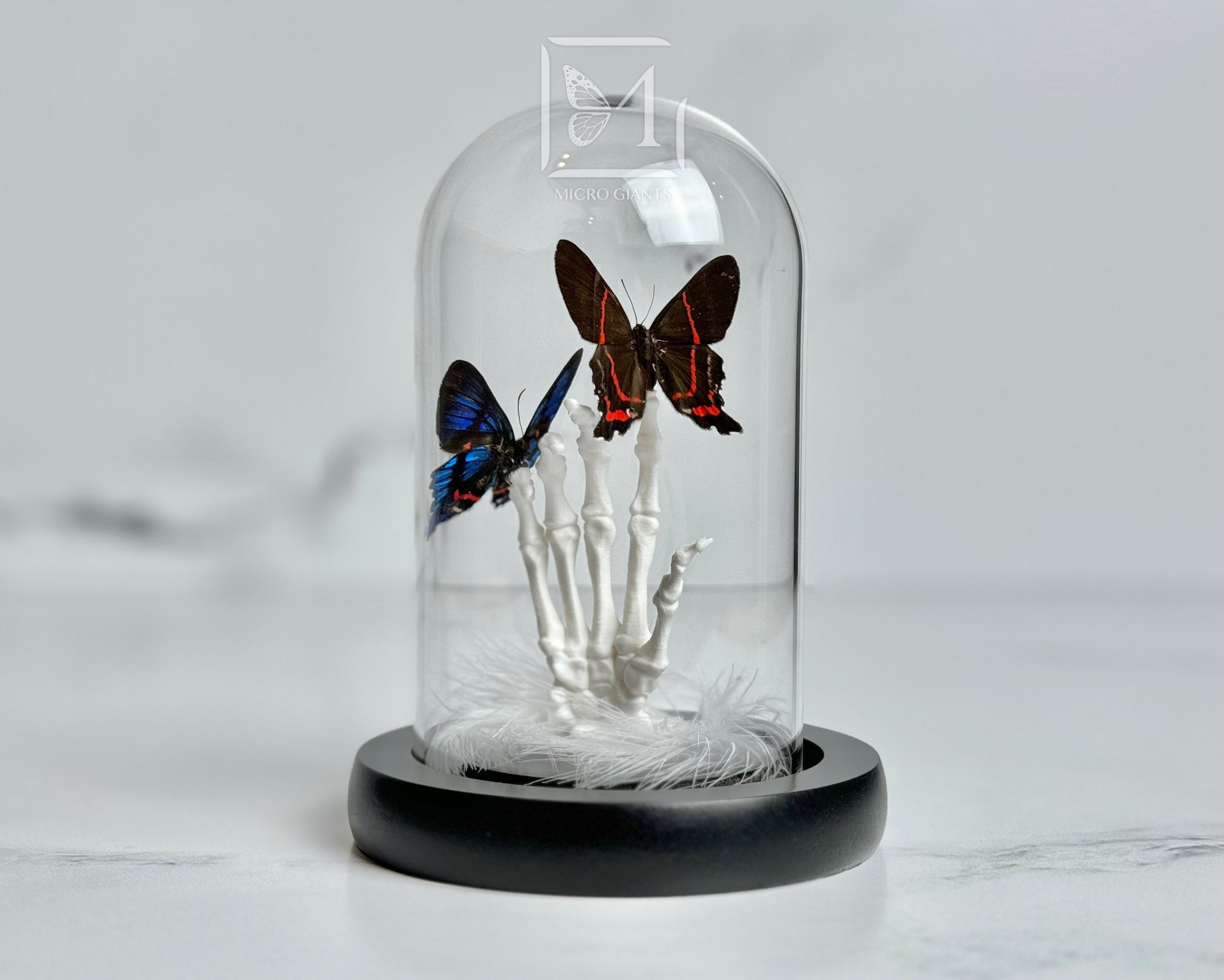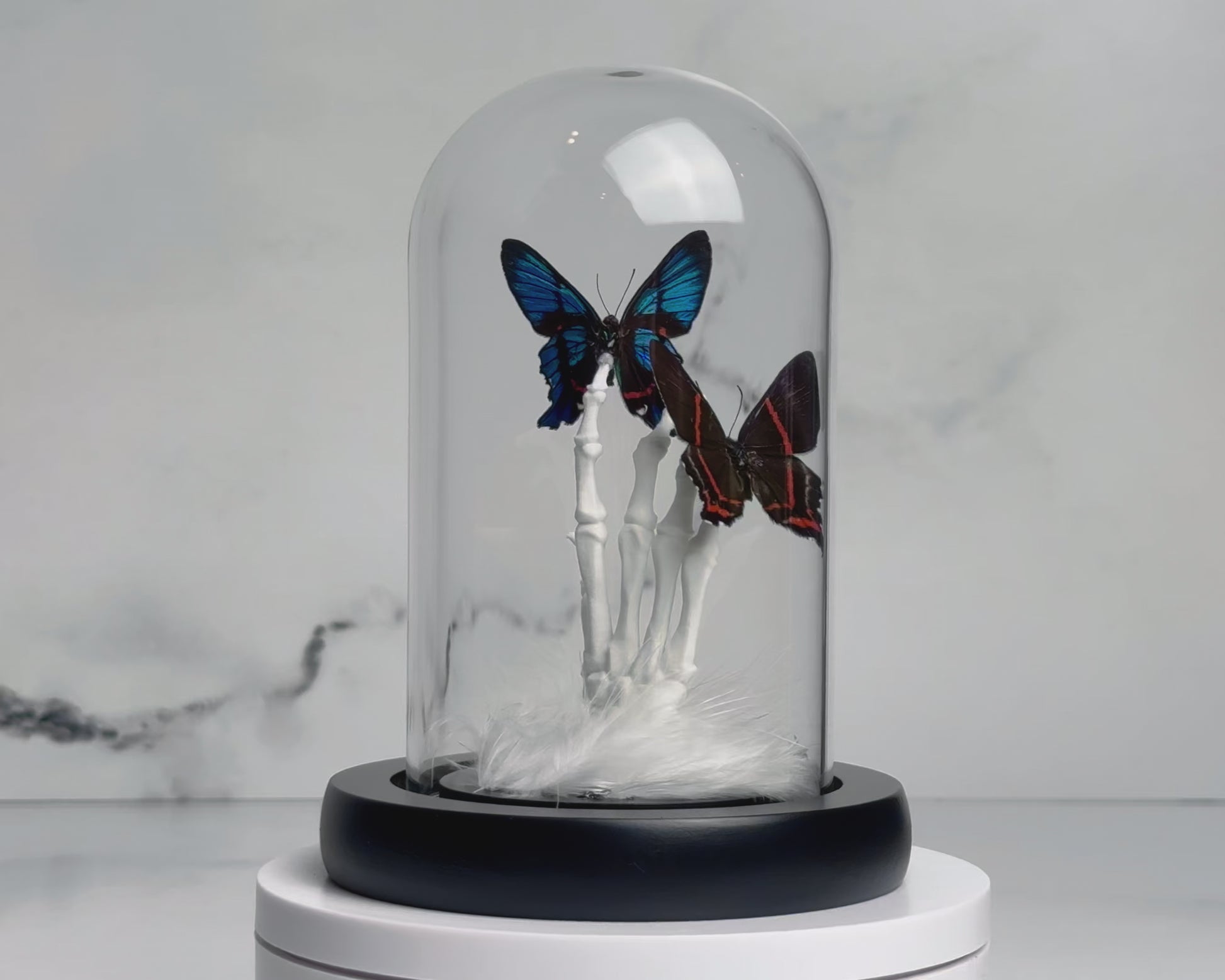 The glass dome showcases two beautiful glass-wing butterflies dancing around a skeleton hand decorated with feathers for a delicate and eye-catching look. It is an exquisite and unique home decoration.