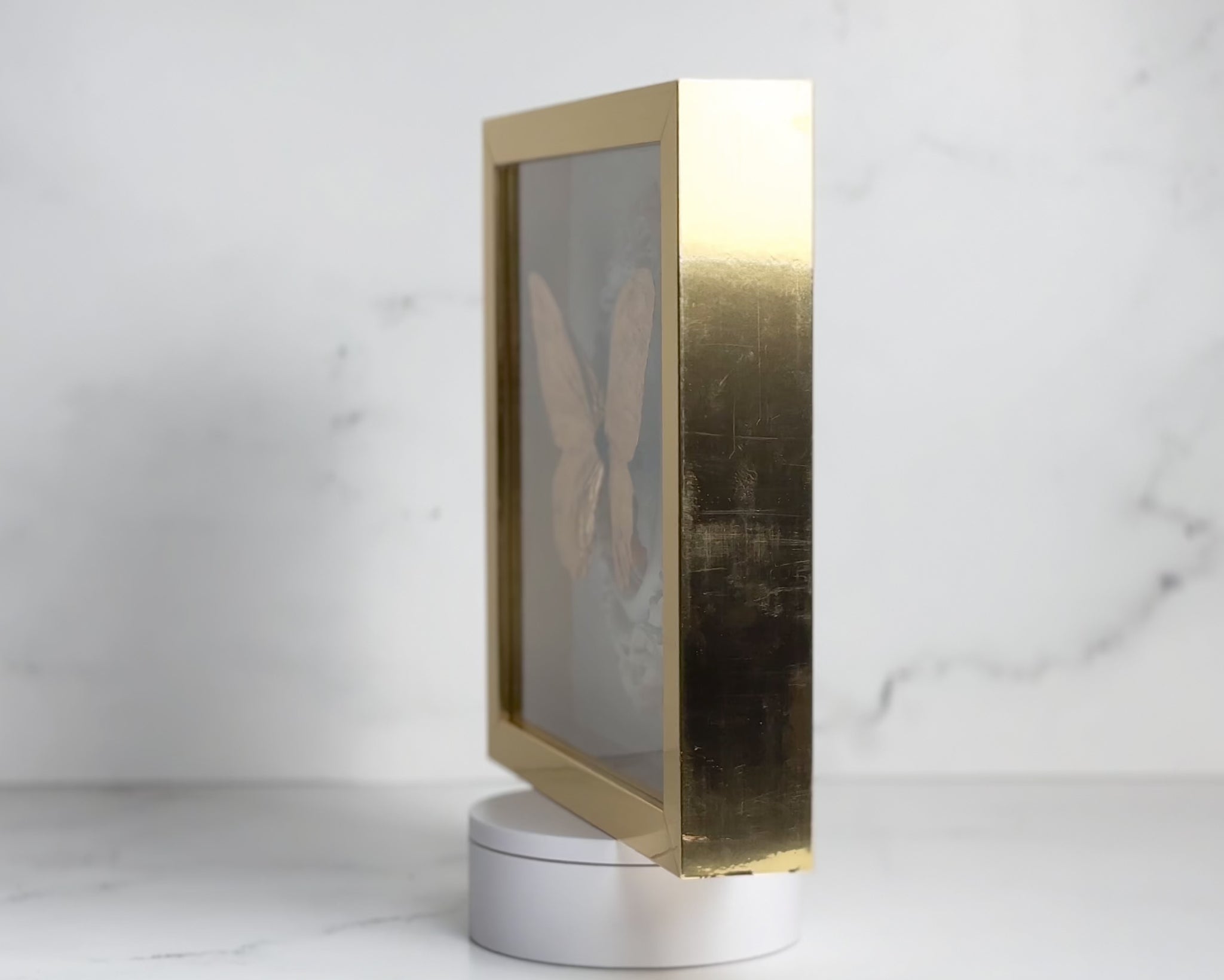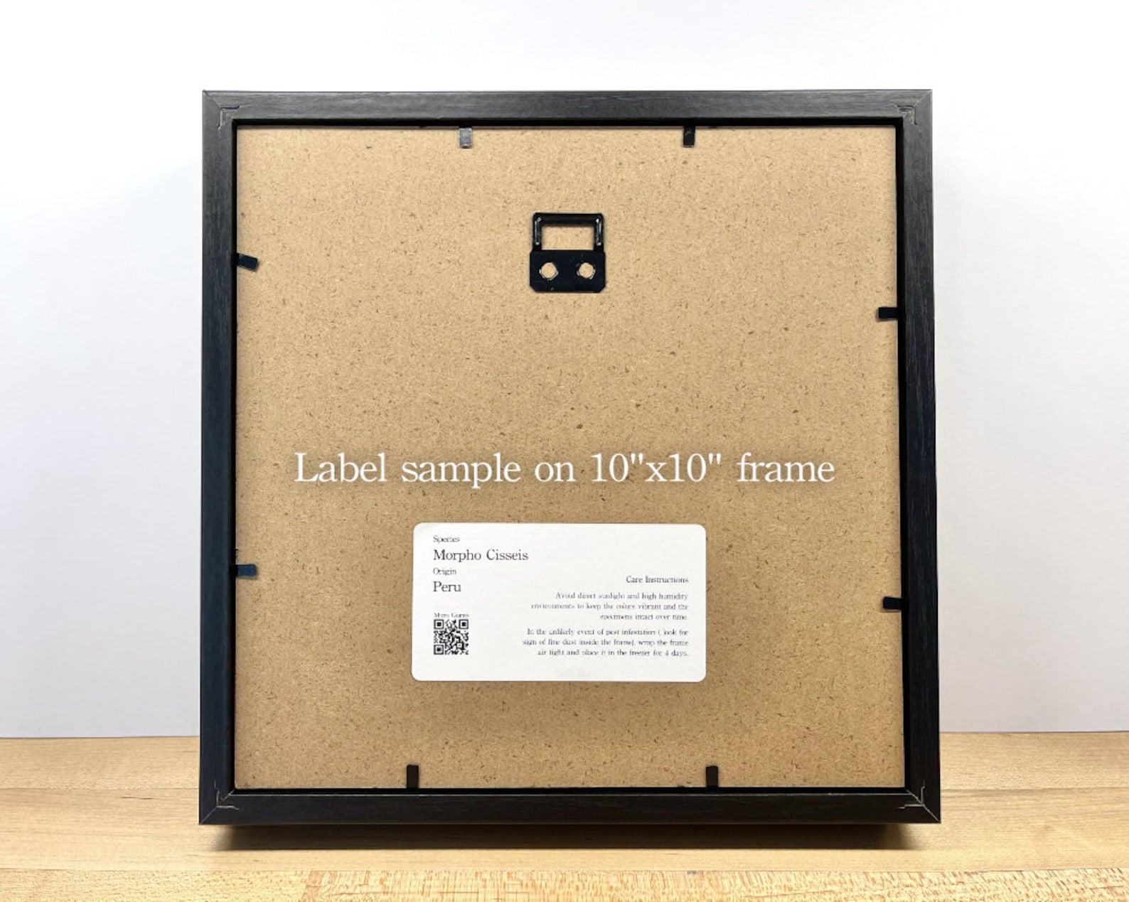Frame: Inside 9"x 9" shadow box. 1¾" deep. Outside measured 10"x10". Can be hung on the wall or stand on its own.