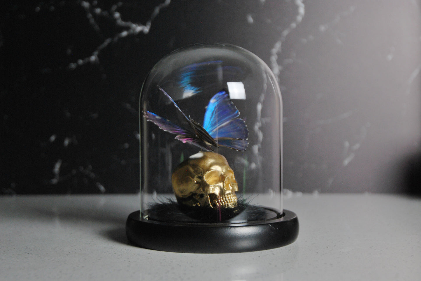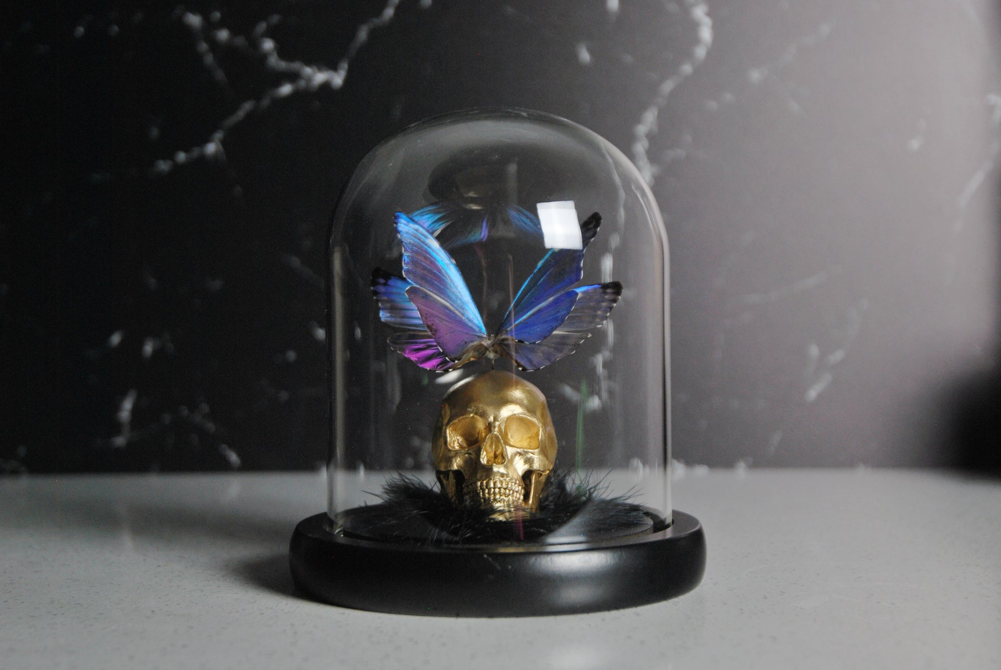 Add a unique touch to your home decor with this unique double wings' morpho adonis, flying above a premium quality 3D printed gold skull. Creating an eye-catching display. Sure to astonish visitors and bring any space to life.
